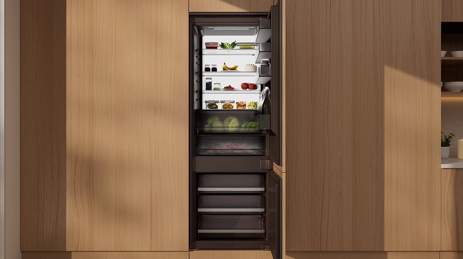 Szeroka chłodziarko-zamrażarka do zabudowy oferuje inteligentne podejście do przechowywania żywności, łącząc wysoką efektywność energetyczną, dużą pojemność i adaptacyjną wydajność chłodzenia. Dzięki sprężarce inwerterowej wspieranej sztuczną inteligencją osiąga klasę energetyczną A, dostosowując wydajność chłodzenia do rzeczywistego sposobu użytkowania i zużycia energii. Komora chłodziarki o pojemności 384 l została wyposażona w system DoorCooling+™, który zapewnia szybkie chłodzenie także w strefie drzwi, oraz szufladę FRESHConverter+™, umożliwiającą dostosowanie temperatury do rodzaju przechowywanej żywności. Tryb AI Fresh uczy się wzorców użytkowania i wstępnie schładza wnętrze chłodziarki w okresach intensywniejszego korzystania, pomagając utrzymać optymalne warunki przechowywania.