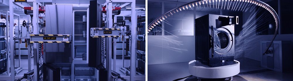 Z kolei test ochrony przed wodą weryfikuje, czy pralki działają prawidłowo w wilgotnym środowisku. Wysokociśnieniowe, obrotowe dysze przez dłuższy czas rozpylają wodę na urządzenie, a inżynierowie dokładnie obserwują, czy komponenty elektryczne nie ulegają zawilgoceniu.