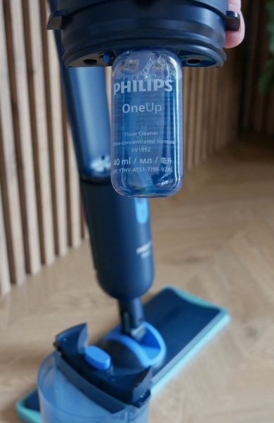 Napełniam zbiornik wodą, instaluję środek czyszczący Philips OneUp w pokrywce od zbiornika (można też użyć innego środka, byle był niepieniący się), mocuję nakładkę mopującą, którą wcześniej zwilżyłem pod wodą i… włączam urządzenie.